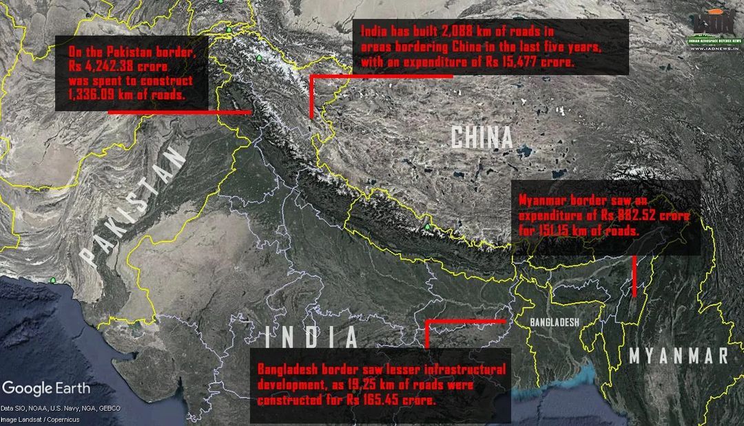 India has built 2,088 km of roads in areas bordering China in the last five years, with an expenditure of Rs 15,477 crore.